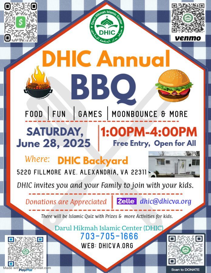 Darul Hikmah Islamic Center (DHIC) would like to invite everyone to join our fundraising event on Thursday, March 27th, 2025 after Isha prayer and before Taraweeh prayer at 5220 Fillmore Avenue, Alexandria VA 22311.